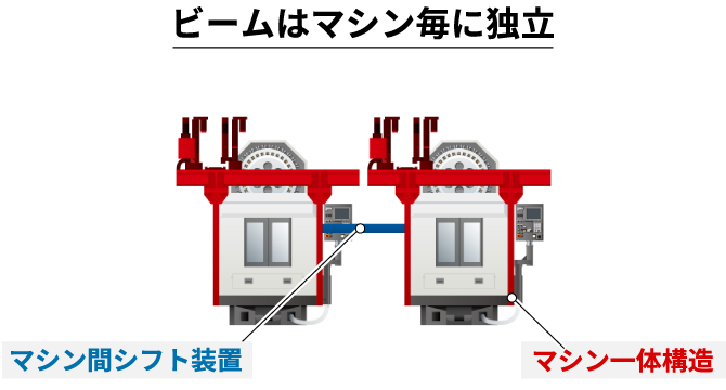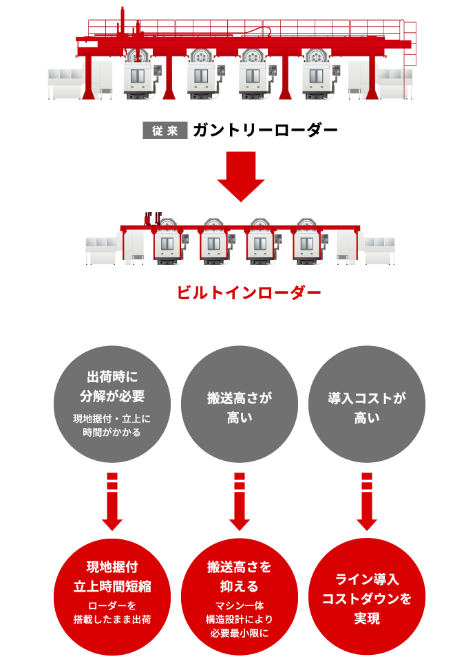 ビルトインローダーは、従来のガントリーローダーとは異なりマシニングセンタとローダーが一体構造となったHowaが提案する次世代搬送装置です。ビルトインローダーはマシニングセンタと一体構造となっているので、ローダーをマシニングセンタに搭載したまま輸送が可能となり、マシニングセンタ据付と同時にローダーの据付も完了することで据付時のセットアップ時間短縮を実現します。ビルトインローダーには、1〜3台の生産ラインに最適な「単独タイプ」と4台以上の生産ラインに最適な「連結タイプ」の2タイプをラインナップ。